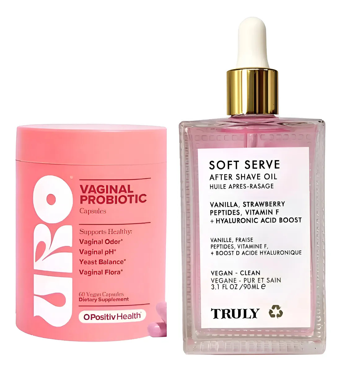 Contiene: 1 frasco de URO Vaginal Probiotic (60 cápsulas) + 1 TRULY Soft Serve After Shave Oil (100 ml)