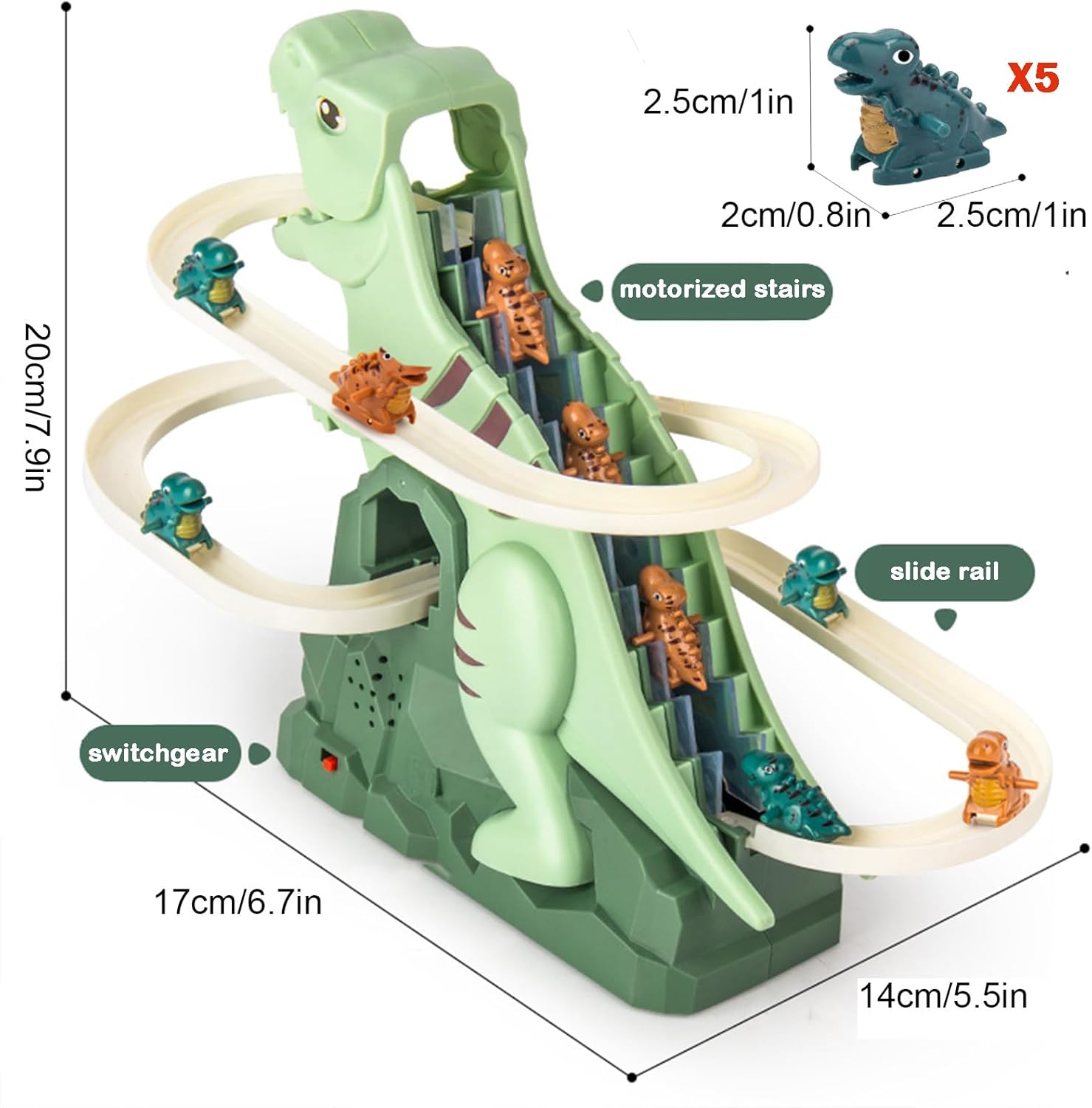- Aventura dinámica de dinosaurios: sumerge a tu hijo en un emocionante mundo de juego con nuestros juguetes de pista de carreras de dinosaurios. Esta pista eléctrica para subir escaleras cuenta con 5 encantadores dinosaurios, luces vibrantes y efectos musicales animados. Observa al dinosaurio subir las escaleras de forma independiente para una experiencia agradable.